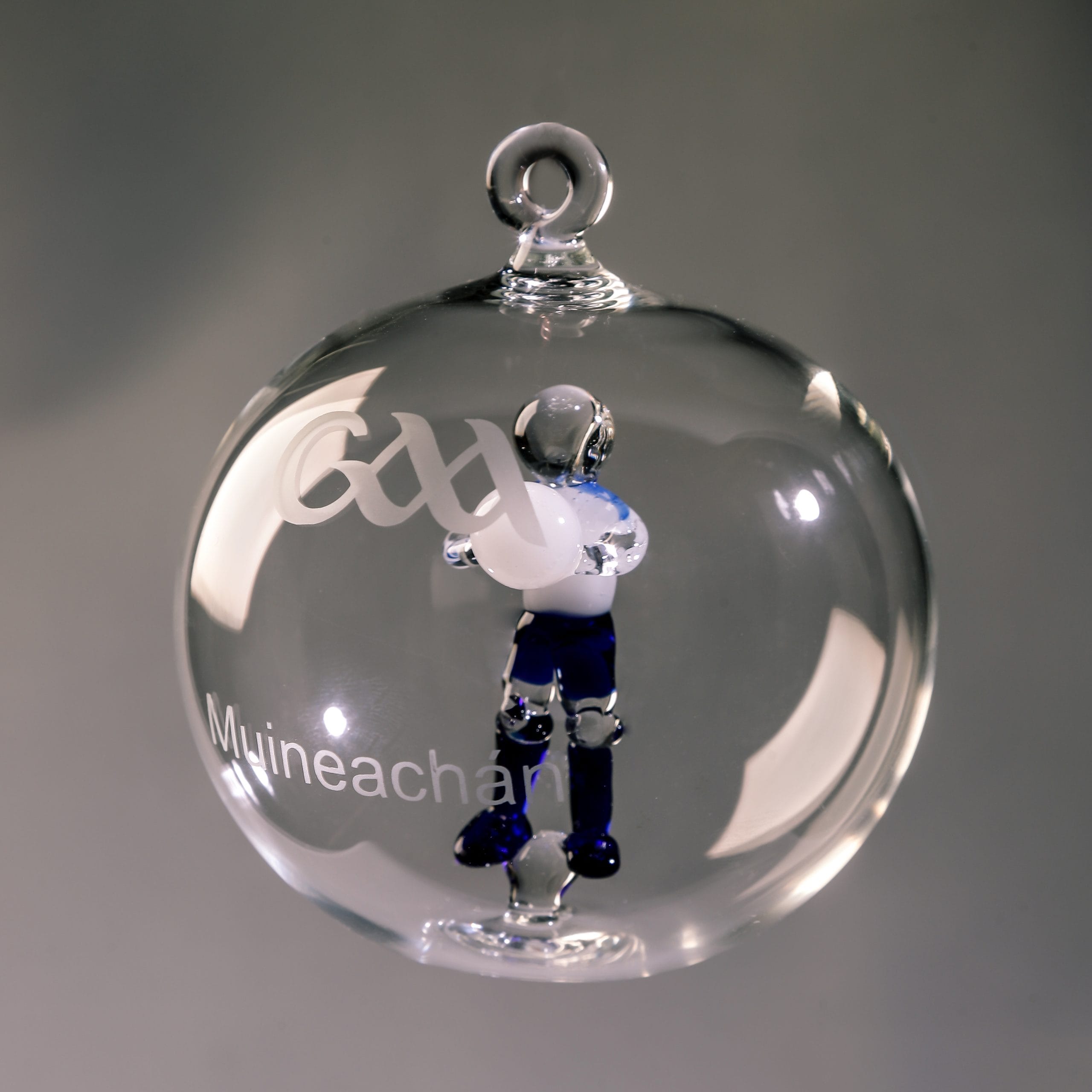 This is Glass art piece. Glass decoration - bauble with figure of Co.Monaghan fotballer inside. This decoration will make any Monaghan supporter or glass art collector proud and happy . Limited edition of 20 pieces made.