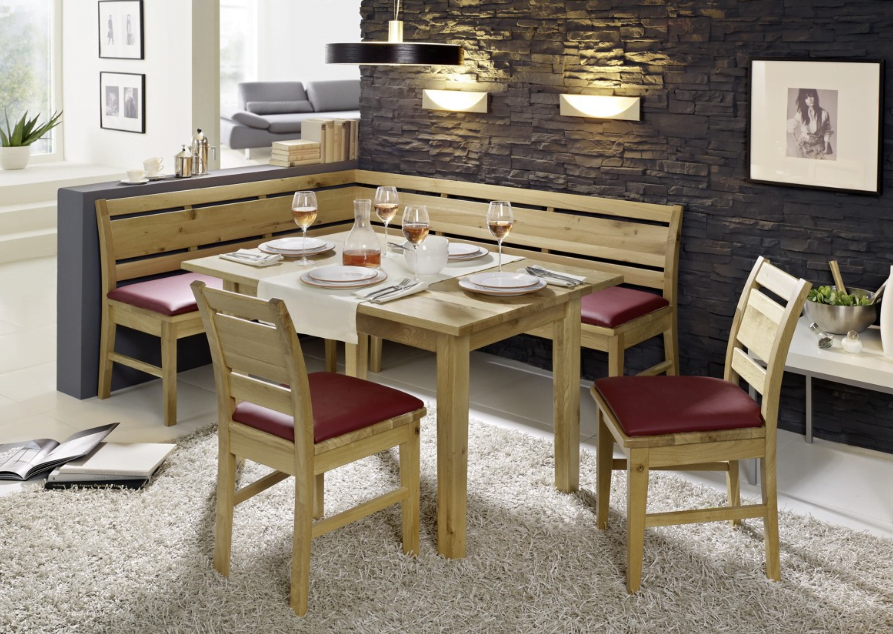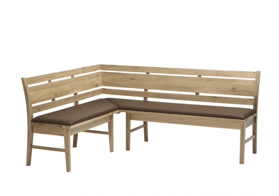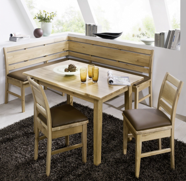 Modern Kitchen corner seating bench Isaac wih table and 2 chairs. All is made from hard beech wood. Size of corner seating unit 170cm x 140cm, table 130cm x 80cm.