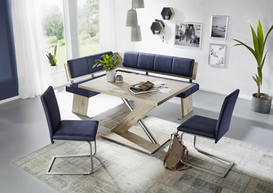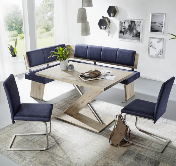 Very modern and fresh look is the kitchen corner unit Dasha. Combination of quality wood & steel. Bench size 125cm x 165cm, Table 70cm x 110cm and 2x Chair.